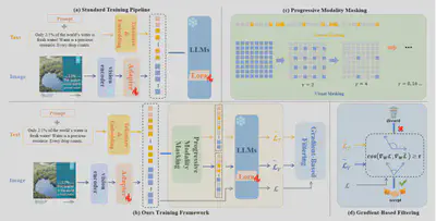 - 论文简介:尽管多模态大语言模型(MLLMs)在跨模态理解方面表现突出,但它们在处理噪声、缺失或模态错配的现实场景时表现出两类重要不足:一是弱化的单模态语义建模,即为追求跨模态关联而牺牲了对单一模态中细粒度线索的敏感度;二是模态偏置,某些MLLM倾向于过分依赖文本或视觉,从而忽视另一模态的关键信息。为此,本文提出了 AimKP 框架,以增强MLLM的单模态理解能力并保持跨模态对齐。AimKP包含两个核心部分:(1)渐进模态遮蔽,通过在训练过程中逐步遮蔽模态信息,迫使模型从被破坏的输入中提取细粒度特征;(2)基于梯度的筛选,通过梯度相似性动态剔除噪声样本,防止其影响核心跨模态学习。该方法首次系统性地将MLLM适配至MKP任务,实验结果也表明AimKP在多模态关键词生成任务中显著提升了模型的单模态理解能力和整体鲁棒性,取得了最优性能。
