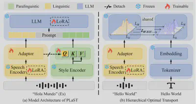 - 论文简介:语音翻译(Speech Translation, ST)旨在将源语言语音直接翻译为目标语言文本。然而,语音信号中除语言内容外,还包含语气、情感、强调等副语言线索(paralinguistic cues),这些信息可能显著影响甚至改变语义解读,从而导致不同的翻译结果。现有ST模型普遍缺乏对副语言信息的直接且充分建模,难以全面感知语音中的语用细微差别,限制了翻译性能的进一步提升。为此,本文提出了一种副语言感知的语音翻译框架(ParaLinguistic-aware Speech Translation, PLaST),通过双分支结构显式分离并融合语言与副语言信息。具体而言,PLaST利用语音编码器与风格提取器分别生成语言表征和副语言表征;为进一步获得与文本对齐的纯净语言表征,引入分层最优传输(Hierarchical Optimal Transport)机制对大语言模型解码器的层间输出进行约束;随后,设计基于注意力的检索模块(Attention-based Retrieval, AR),以语言表征为查询,动态检索并精炼副语言信息,实现语义理解与翻译生成的联合引导。在副语言敏感基准ContraProST上的实验表明,PLaST显著优于现有强基线方法;同时在标准语音翻译数据集CoVoST-2上也展现出良好的泛化能力,验证了该方法的有效性与实用性。