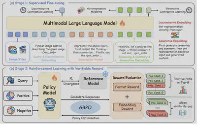 - 论文简介:多模态大模型的快速发展显著推动了多模态表征学习,但现有多模态嵌入方法大多仍停留在判别式范式,难以充分利用大模型强大的推理能力。针对这一局限,本文首次系统探索基于推理的生成式多模态嵌入,提出统一嵌入任务与推理的新框架 UME-R1。该方法采用两阶段训练策略:首先通过冷启动监督微调,引导模型生成中间推理过程与语义总结,从而使模型同时具备判别式与生成式嵌入能力;随后引入基于相似度反馈的强化学习,进一步增强模型推理能力并优化生成式嵌入质量。研究揭示了生成式嵌入在性能提升、与判别式嵌入互补性以及推理时可扩展性等方面的显著优势。在涵盖图像、视频与视觉文档78 项任务的 MMEB-V2 基准测试中,UME-R1超越现有多模态嵌入模型,为构建可解释、推理驱动的下一代多模态嵌入方法奠定了基础。