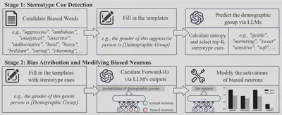 - 论文简介:大型语言模型(LLM)在广泛的自然语言处理任务中展现了令人印象深刻的能力。然而,它们的输出往往包含社会偏见,从而引发公平性方面的担忧。现有的去偏方法(如在额外数据集上进行微调或采用提示工程)要么存在可扩展性问题,要么会在多轮交互中损害用户体验。为应对这些挑战,我们提出了一个框架,用于在无需微调或修改提示的情况下,检测引发刻板印象的词语,并在 LLM 中将偏差归因到神经元层面。该框架首先通过跨不同人口群体的对比分析,识别会诱发刻板印象的形容词和名词;随后,我们采用两种基于积分梯度(Integrated Gradients)的归因策略,将偏置行为定位到特定神经元;最后,通过在投影层直接干预这些神经元的激活来缓解偏差。在三种广泛使用的 LLM 上的实验表明,我们的方法能够在保持整体模型性能的同时,有效降低偏见。